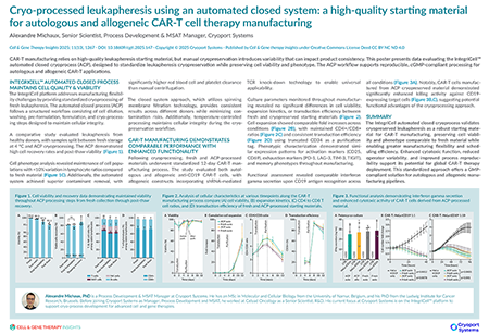 ![]() | CAR-T manufacturing relies on high-quality leukapheresis starting material, but manual cryopreservation introduces variability that can impact product consistency. This poster presents data evaluating the IntegriCell™ automated closed cryoprocess (ACP), designed to standardize leukapheresis cryopreservation while preserving cell viability and phenotype. The ACP workflow supports reproducible, cGMP-compliant processing for autologous and allogeneic CAR-T applications. This video presentation, accompanied by a poster summary, highlights how cryo-processed leukapheresis performed in an automated closed system can reliably generate high-quality starting material that supports robust, scalable manufacturing of CAR-T cell therapies.